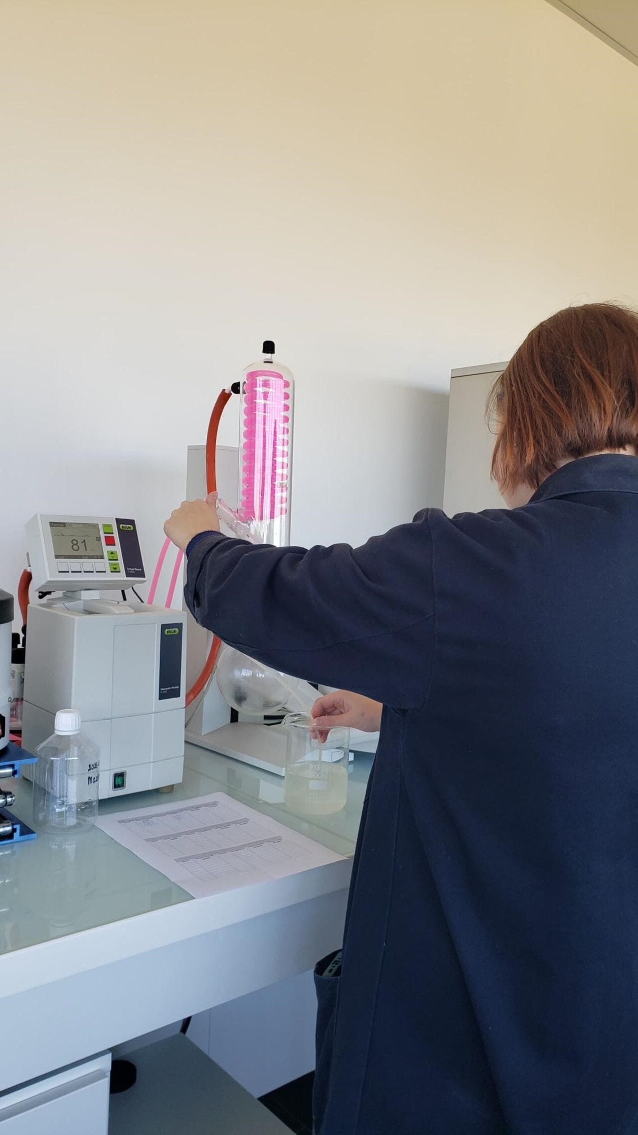 Une fois les macérations réalisées, nous distillons en petits volumes à l’évaporateur rotatif pour obtenir des distillats d’essai.