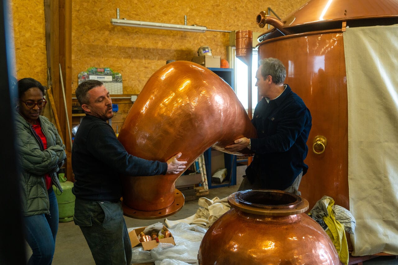Tout commence par un voyage vers Cognac. Expédié pour inspection, le verdict tombe : malgré son âge et les marques du temps, le Rockley peut être restauré. La partie basse, d’origine, est conservée. Mais son col de cygne, pièce essentielle orientée vers le bas pour capturer les arômes les plus lourds, doit être entièrement recréé.